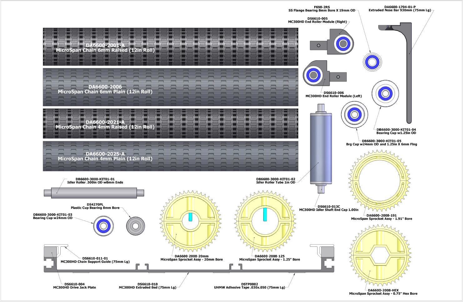This item is a standard MicroSpan sprocket used on all MicroSpan transfers. It is made from durable acetal. It comes standard with 1.25" round bore. Other bores are available on request. Drawing below shows different sprocket sizes available. The sprocket comes as a split two piece assembly with hardware.